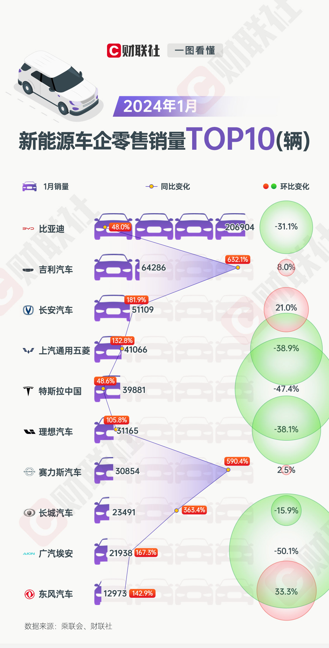 在经历去年年底降价冲量后,一月份往往是车市销量淡季。近期,各大新能源汽车厂商相继揭晓了2024年首张销量成绩单,整体同比呈现明显增长态势,而环比表现不尽如人意。车企两极分化明显,新能源车企零售销量TOP10榜单相较上月也出现了较大变化。